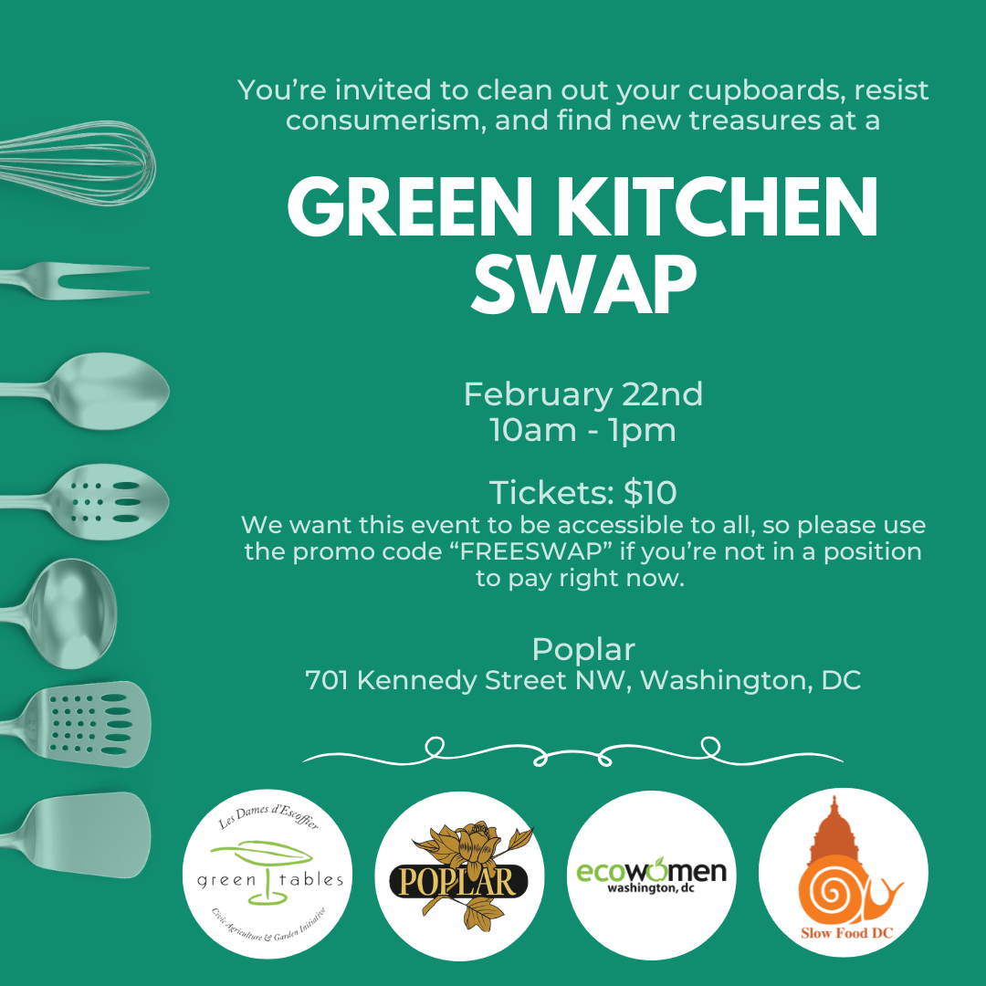 You’re invited to clean out your cupboards, resist consumerism, and find new treasures at a Green Kitchen Swap hosted by the DC Regional Chapter of Les Dames d’Escoffier and Poplar, in partnership with Teaism, DC Ecowomen, and Slow Food DC.